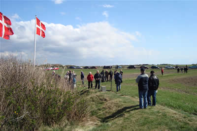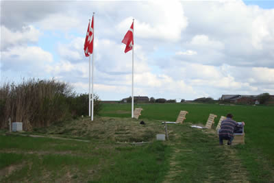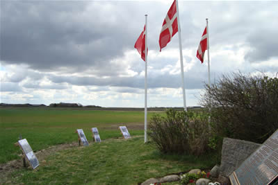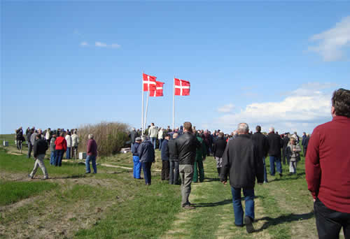 Other Stadil locals, Mr Leif Nielsen and Mr Tommy Nielsen, helped setup the PA system which was provided by Mr Sigvald Brusberg. Mrs Else Jeppesen made coffee and the delicious biscuits which were served to the large crowd. Mrs Kirsten Olesen (from the Stadil archives) sponsored the coffee. Mr Ole Kamp from the Ringkøbing Skjern Kommune (RSK) kindly hosted as Master of Ceremonies, and the RSK provided three fine Danish Flags and arranged for the flagpoles to be erected and removed. Mr David Ashton read the poem “Wings of Thunder” and played "amazing grace" on his whistle. The kind support of Mr Erik Jepsen and his father Mr Egon Jepsen, who own the land at the crash site, kindly prepared parking areas and provided materials for the setup at the site. And our special thanks and appreciation go to Mrs Dormi and Mr Kurt Petersen for stepping in at late notice and ensuring an aerial salute! |
