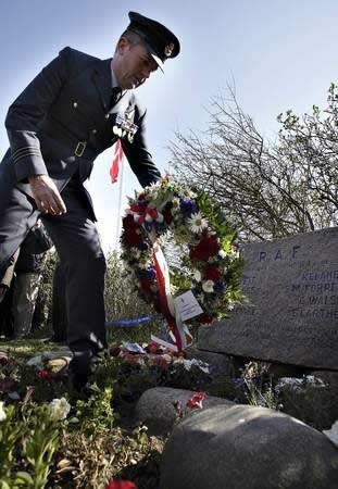 Mrs Jesse Bowler was assisted by Royal Air Force Squadron Leader Gavin Fraser to lay a wreath in memory of her former husband, Lancaster EE138 crew member Sergeant Ernie Thirkettle.