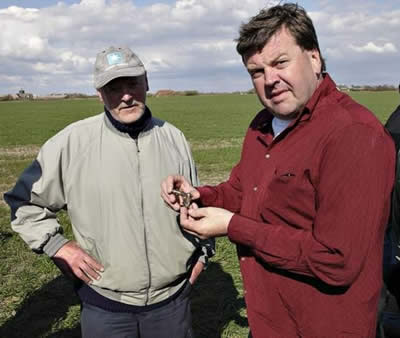 10 years ago Mr Bent Pauli Madsen (pictured below left) found this piece of wreckage at the EE138 crash site. The piece was apparently identified as being a part of the engineers area. Mr Pauli Madsen presented the piece to Mr Peter Forrester (pictured below right), nephew of Sid Forrester, the pilot of Lancaster EE138. Mr Pauli Madsen felt happy that the piece was "going home".