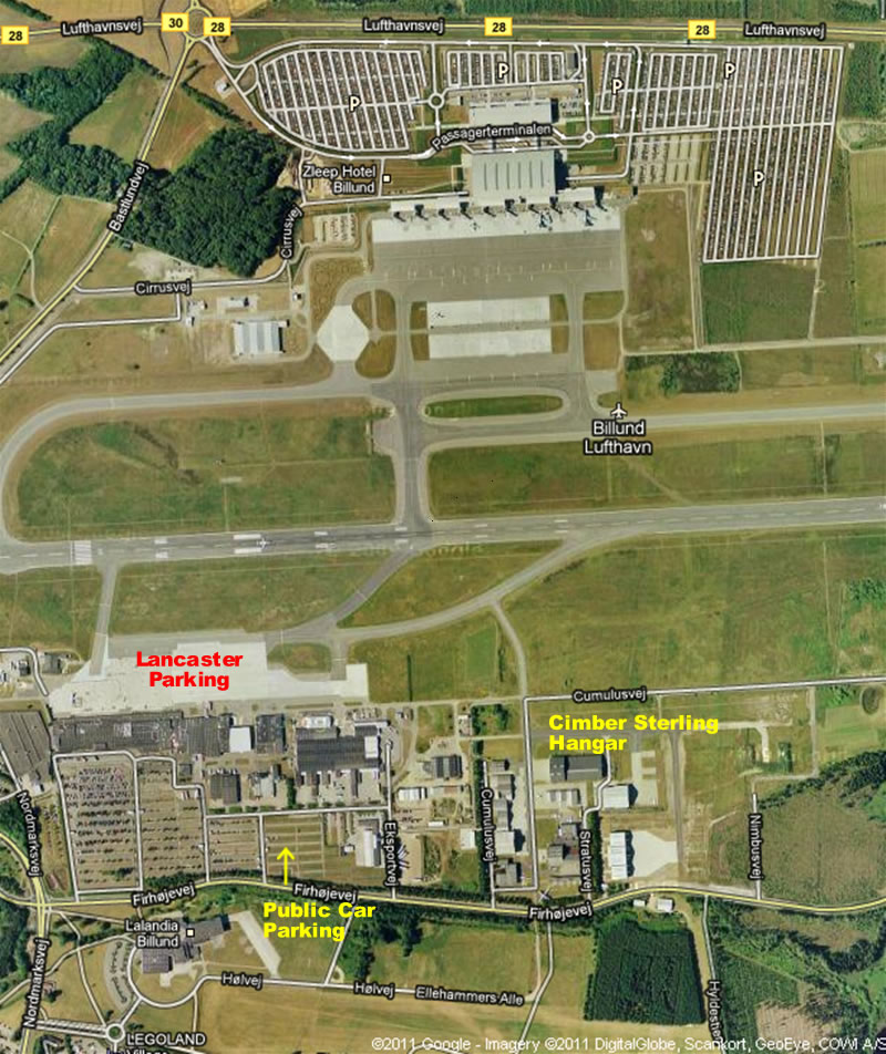 Billund Airport – BBMF Lancaster viewing 6th May 2011 After completing fly pasts over Denmark, the BBMF Lancaster will land at Billund Airport at 15:25 on the 5th May 2011. The air craft will spend the night on the parking apron. On the morning of the 6th May 2011 the Lancaster will be towed to the Cimber Sterling hangar - the Danish home guard + airport security will secure the area. The BBMF Lancaster will be on display to the public from 09:00 – 10:00 on 6th May 2011 in the Cimber Sterling Hangar at the Billund Airport. Members of the public will be able to get right up to the aircraft, although no access will be permitted to the interior. The crew will also be onsite to pose for photos and answer questions. General public car parking is available as shown on the map below, there will be shuttle buses running from the car park to the Cimber Sterling hangar (or about 10 minutes walk). Stratusvej road to the hangar will be closed to public cars. The gate will open at 09:00 and the Lancaster can be viewed until 10:00. Then the crew will prepare the Lancaster for flight, the Lancaster will take off later that morning. The following Google map describes the car parking at the Billund Airport, the location of Cimber Sterling Hangar and shows the overnight parking location of the BBMF Lancaster: