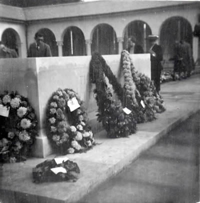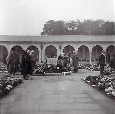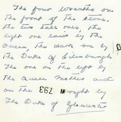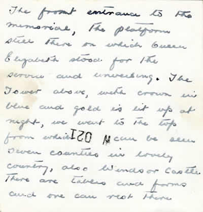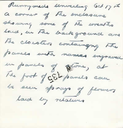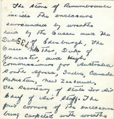 Runnymede Photos: The following photos were sent to Mrs Nell Forrester (mother of crewmember Forrester) by Mrs Evelyn Lee (mother of crewmember Jowett) from the opening of the Runnymede Memorial on the 17th October 1953. Here is an extract from her accompanying letter describing the event: "...I wonder if you heard the broadcast of the unveiling or did you see it on television. It is a marvellous memorial, all in white stone and the ceiling of the cloisters where the panels are with the names, has wonderful paintings, in a heavenly shade of blue with gold stars scattered all over. There is a huge window, with the verse cut in the glass, I am enclosing a photo of it. There was such a crush on the 17th we were only able to spend a short time inside and lay the flowers, but we went down again on the Tuesday and spent the day there and took some photos. There were 60,000 wreaths, sprays etc, just like a huge carpet of flowers, we placed one for Sidney and Ewin Carthew putting a card on from the families. Their names were together under the Australian section, we took photos of the panel, but being inside the building, they did not take, however I am trying to get a photographer to see what he can do and will send you one if successful. The service was very moving, with my favourite hymns, The Lord is My Shepherd and Oh God Our Help in Ages Past. The Queen and Duke, the Queen Mother and Duke of Gloucester walked among the relatives afterwards. We went down with Mr and Mrs Thirkettle and spent some time with them whilst we were in London. We also visited Jessie, Ernie Thirkettle’s former wife. I have written on the enclosed photos...." |