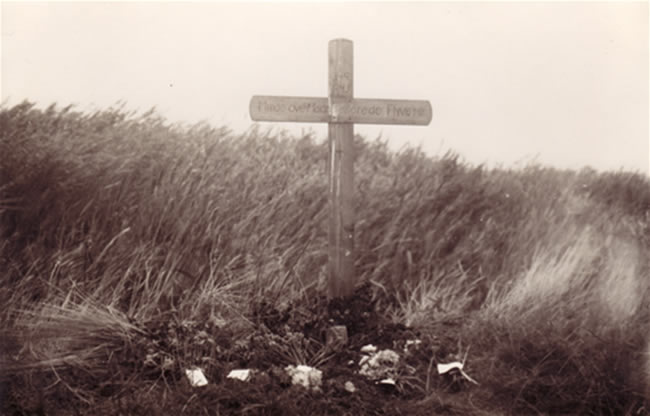 Photo showing the original cross taken by Mrs Lee (mother of HF Jowett) on September 8th 1949. It is this image of the cross and flowers that so deeply touched Mrs Lee. The site of her at the cross inspired Ingemann Halkjær to recommend that the local Stadil community take a collection and raise a memorial stone.