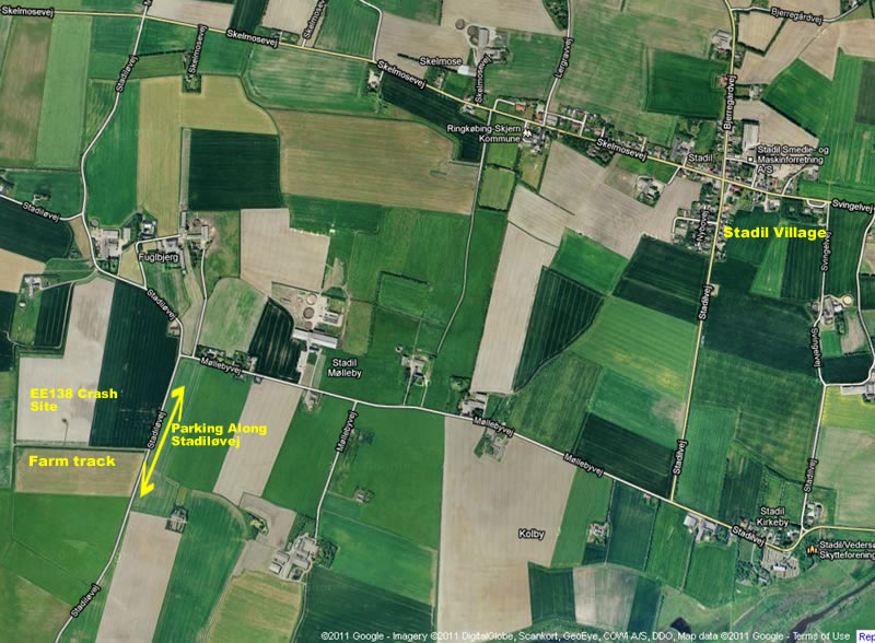 The EE138 Crash site is located near the S.W. intersection of Stadiløvøj & Mollebyvej, Stadil, 6980 Tim. The following map shows the crash site in relation to the village of Stadil, the farm track and parking along the road side. Stadil is approx. 17 kilometres North of Ringkøbing.