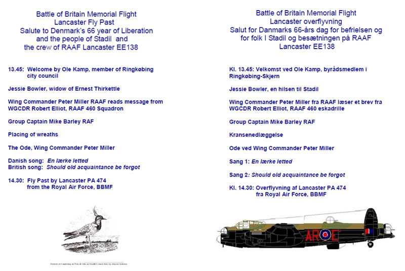 Stadil EE138 Crash Site - Lancaster fly past 5th May 2011 The BBMF Lancaster is due to perform a series of 3 low level (500 feet) fly pasts of the EE138 crash site at 14:30 on 5th May 2011. BBMF Lancaster PA474 is painted with the nose art of Lancaster EE139 - "The Phantom of the Ruhr". A ceremony commemorating the 66th year of Denmark's Liberation will be held at the EE138 crash site, commencing at 13:45. Please note that the field surrounding the EE138 memorial has been planted with turnips this year. We ask that everyone respect the farmer's crop, and please keep to the roads, paths and tracks. Please do not walk over the crop! A limited number of people will be able to gather directly by the memorial stone and plaques, but there is plenty of excellent viewing along the farm track and road side. A public address system will ensure that everyone can hear those giving speeches. The ceremony should finish 10-15 minutes prior to the Lancaster fly past, this will allow people to move back from the memorial for better viewing of the Lancaster as it flies low over the crash site. The following outlines the format of the ceremony and crew relatives from Australia and the UK will be traveling to Denmark for this exciting event. Representatives of the Danish Home Guard, RAF and RAAF will also be present to witness the first return of a Lancaster to the skies of Denmark since the end of WWII.