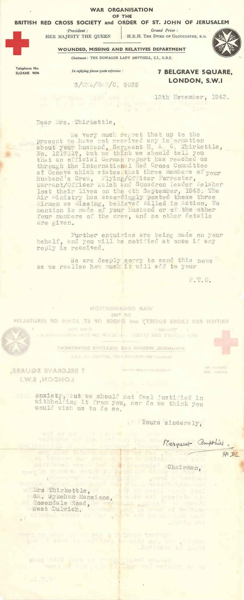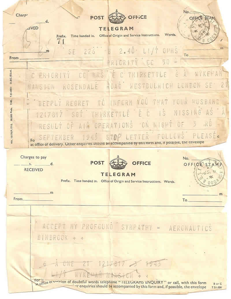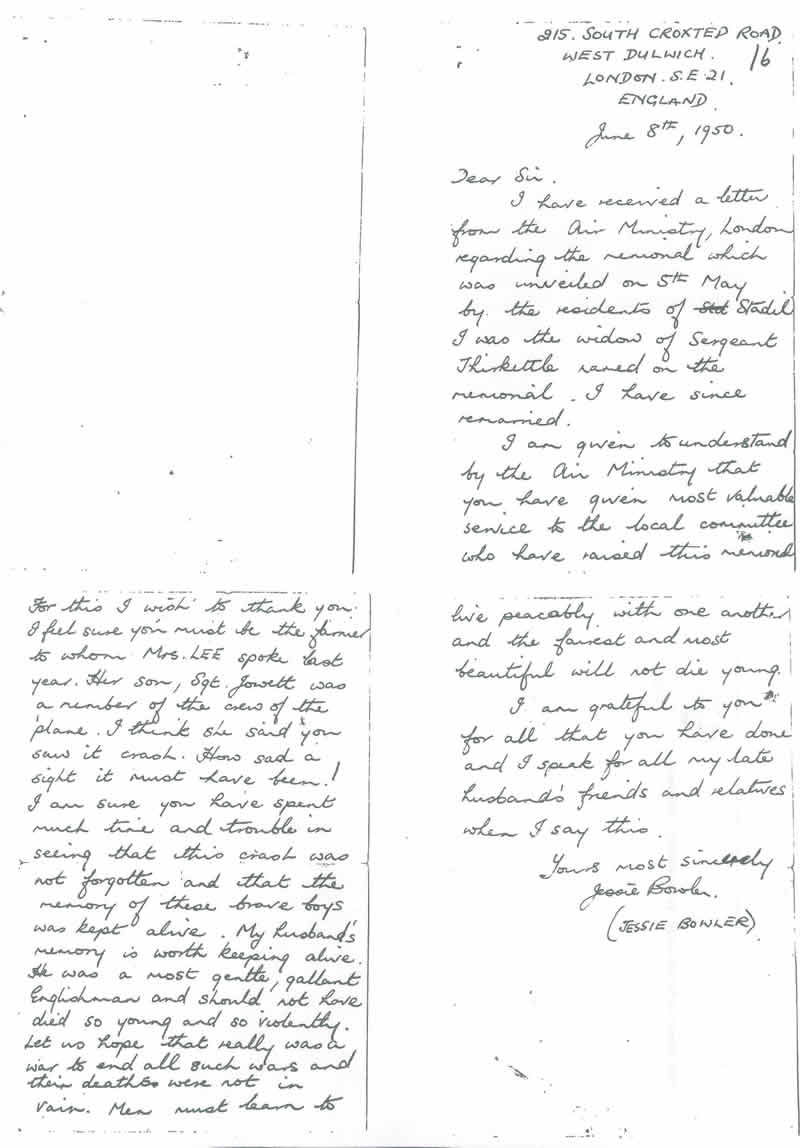 My name is Mrs Jessie Bowler (formerly Thirkettle). I was married to Sgt. Ernest Thirkettle in November 1942 when I was 19 and he was 22 years old. [After 4 September 1943] Throughout the rest of the war I waited in vain for news of him. I met and married my husband Donald in 1947, the father of my two children. He died in June this year [2006] and his death brought forth stories and photographs of days long ago. My daughter looked on the internet for the name Thirkettle and found this website [Peter Dunn's 460 website]. It was very strange to see photos there of which I have my carefully kept copies. I also have a letter from Mr. Ingemann Halkjær and from Peder Christensen and some seeds from marsh plants which grow at the site of the crash. I am so glad that the people of Stadil have looked after the grave for all these years. Those men were so young and so brave. Thank you. God bless you.