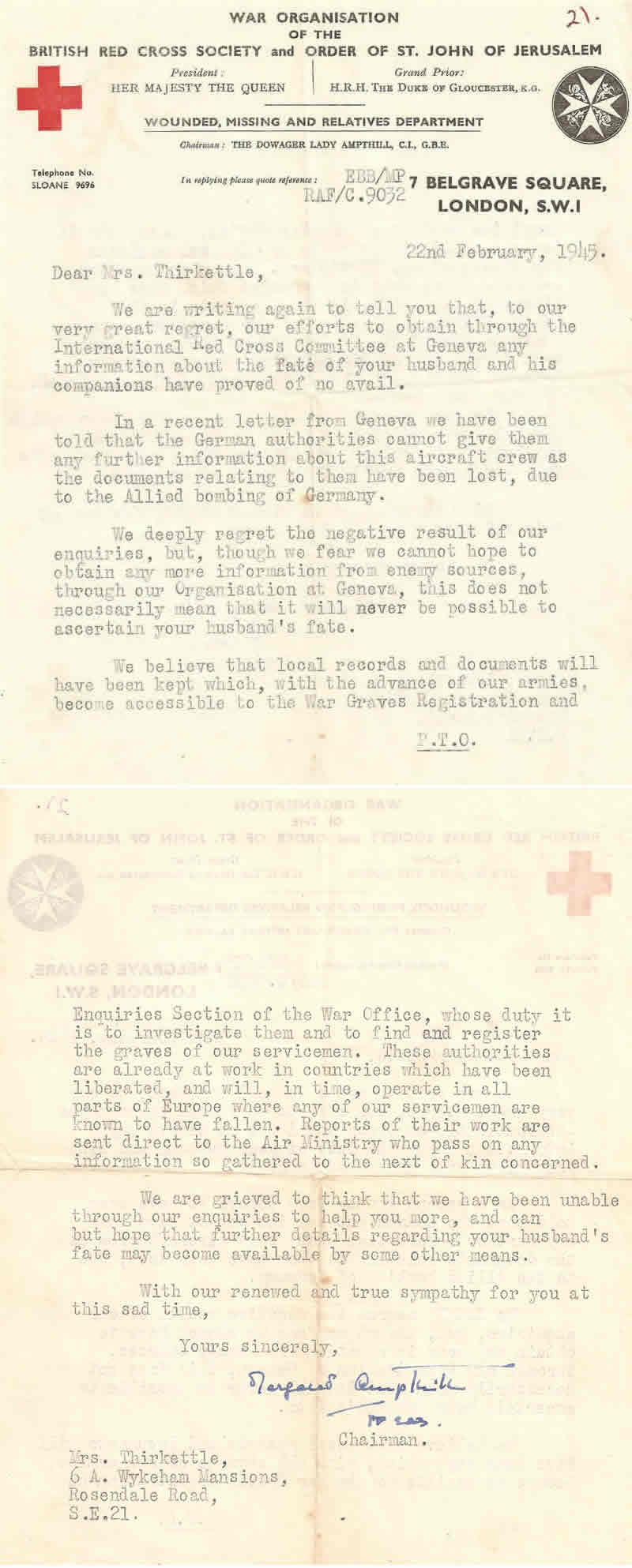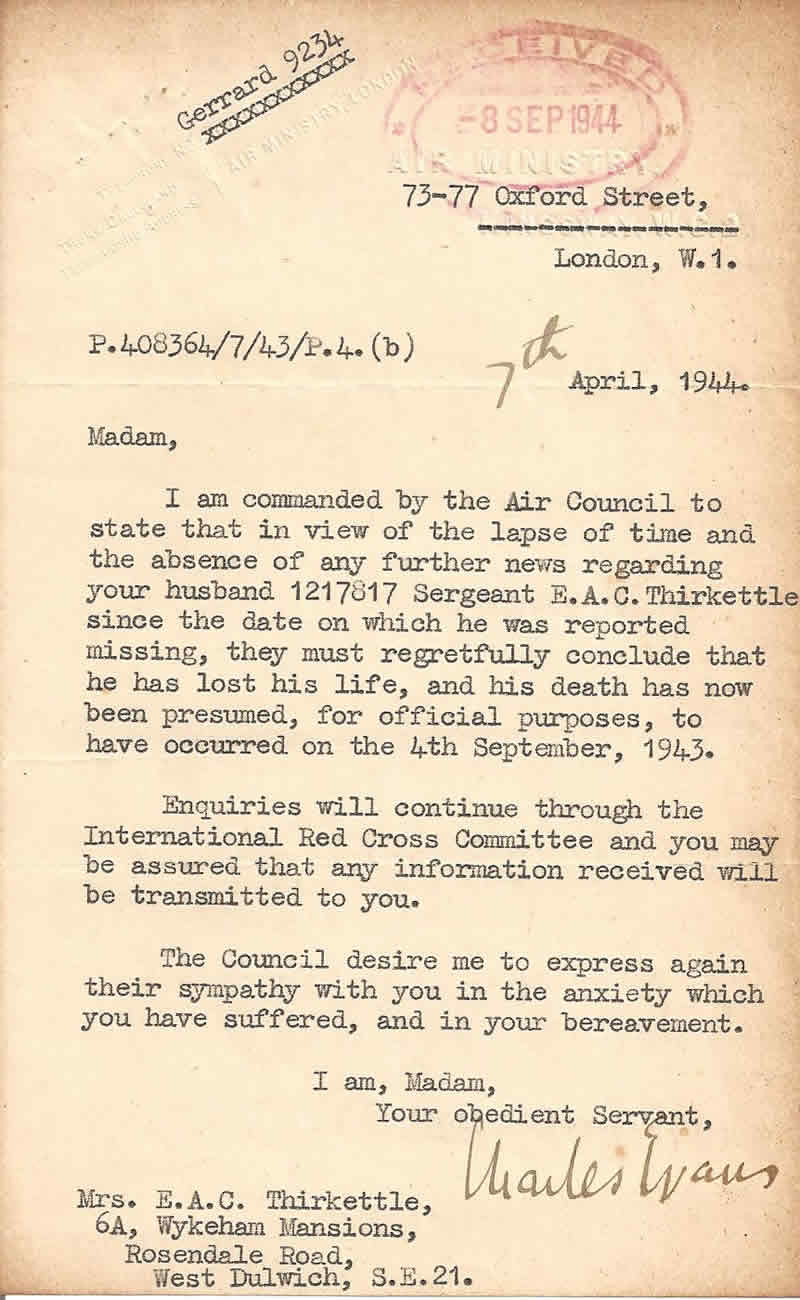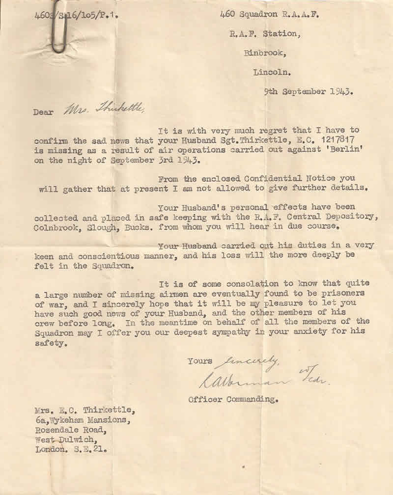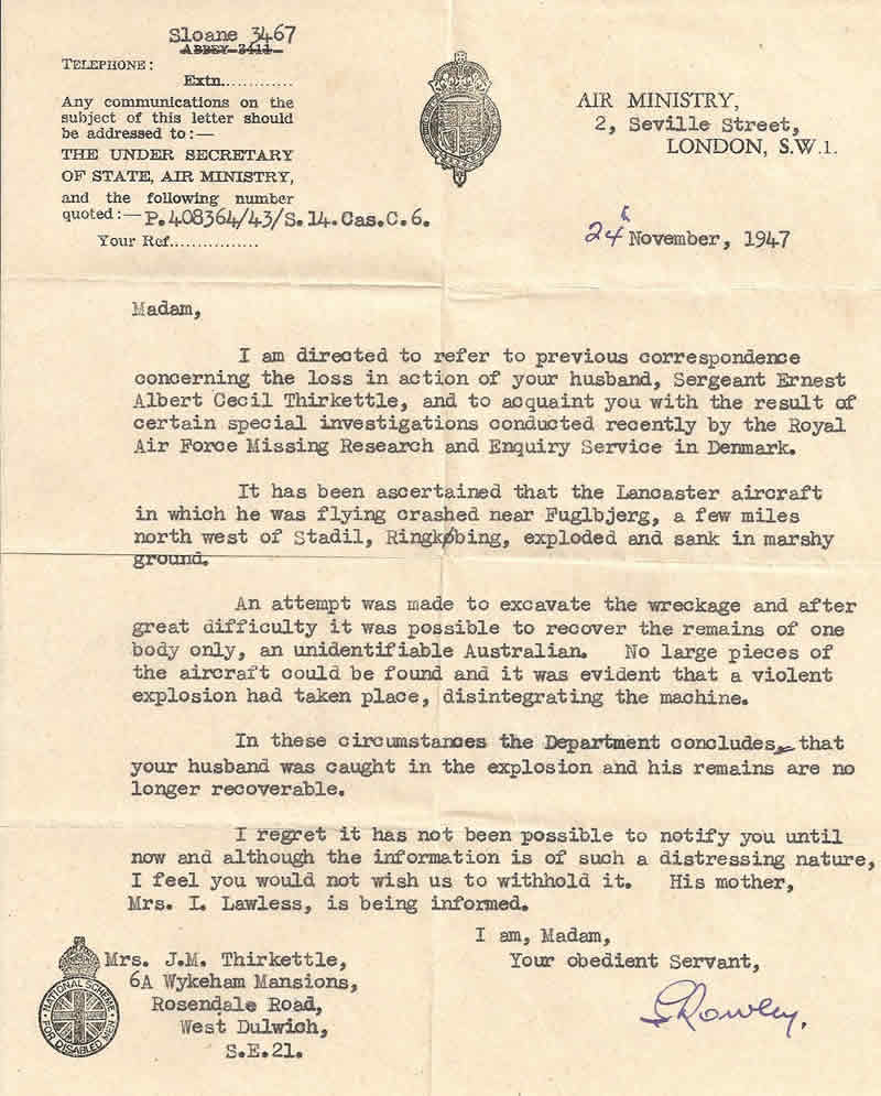 From Mrs Jessie Bowler: Ernie was born in London on 3rd October 1920. He had a brother Roy about 3 years younger who served in the RAF and a sister Jean who joined the Salvation Army and married a Salvationist. She was about 10 years younger so would now be in her 70s. Ernie went to Buckingham Gate High School in London near to Buckingham Palace. We met when I was 13. I suppose you would call us childhood sweethearts. He left school at about 17 and worked as a clerk for an estate agency. Family legend says his surname is Norwegian in origin. He was certainly Nordic looking. I have lost touch with his family. I stayed for a time with Mrs Lee of Burnley, mother of Bert Jowett, and she stayed with me in London after the war. Bert was her only child. She had a niece - daughter of Clifford Meadows of Burnley, who would now be in her 70s. We are all getting so old. I do not have any information about any others of the crew members. I think Ernie mentioned Hamburg and Essen. He was very excited at the idea of becoming a Pathfinder, but being newly married we mostly talked about our future when the war would be over. Links to a selection of official correspondance to Jessie Bowler (then Thirkettle) on the loss of her husband: 4/9/1943 - 1st Telegram from Binbrook 9/9/1943- Letter from 460 Squadron Binbrook Commanding Officer 29/10/1943 - Letter from British Red Cross 13/11/1943 - Letter from British Red Cross 7/4/1944 - Letter from Air Ministry London 22/2/1945 - Letter from British Red Cross 24/11/1947 - Letter from Air Ministry London 8/6/1950 - Letter to Ingemann Halkjaer