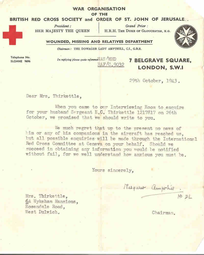 From Mrs Jessie Bowler,widow of Ernest Thirkettle: Ernest Albert Cecil Thirkettle was born in London on 3rd October 1920. He went to Buckingham Gate High School in London, near to Buckingham Palace. He left School at 17 and worked as a clerk in an Estate Agents' Office. He joined the RAF on 31st January 1941 and volunteered for Air Crew. He married Jessie Ellis (whom he had known from schooldays) on 15th November 1942. He was 22 and she was 19. He became an Air Gunner and went to Binbrook in July 1943 - joining 460 Squadron on 30th August 1943. Link to a Danish Television Documentary Det lange farvel (The Long/Last Farewell) by Uffe Bregendahl TV/Midt - Vest - produced following the 65th Commemoration in 2008: http://www.tv2regionerne.dk/?id=461175&r=6